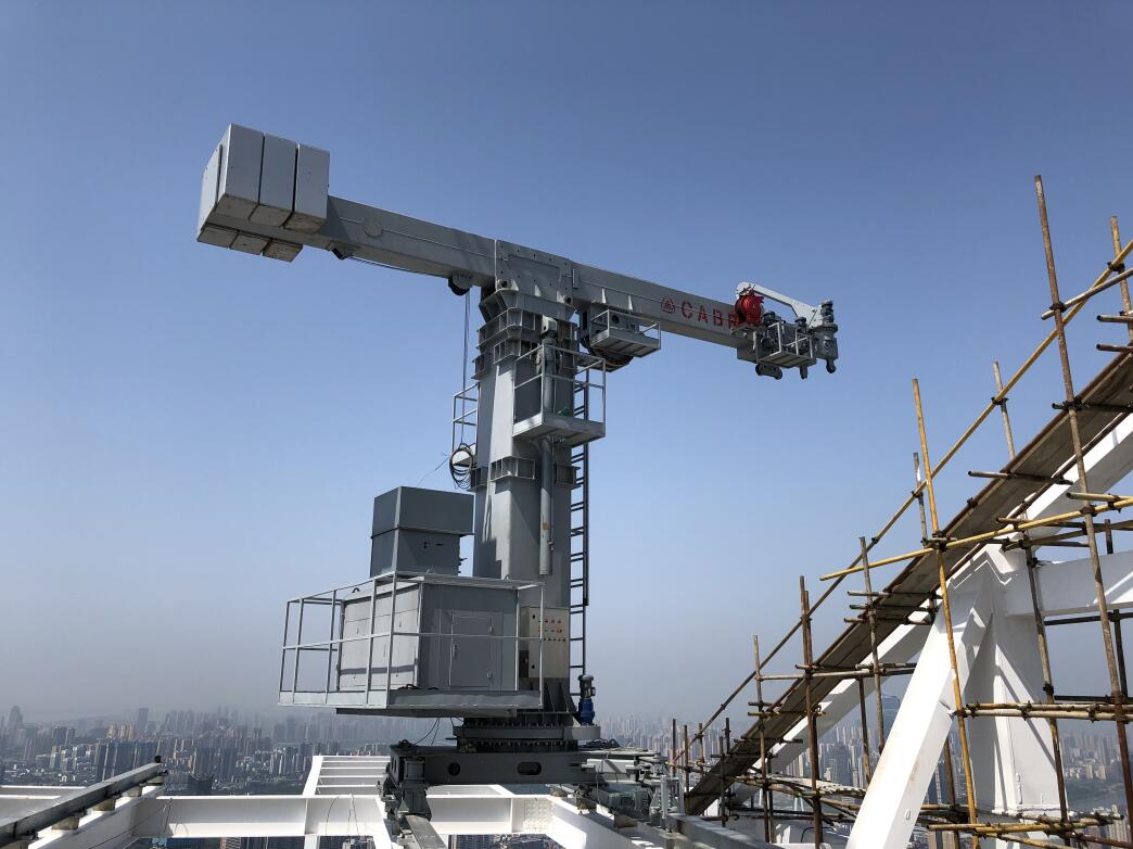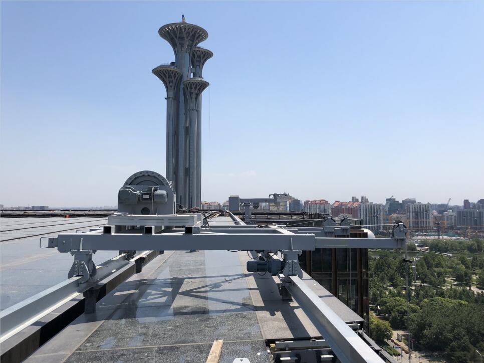 該項目所配備的屋面軌道式擦窗機工作高度460米,采用立柱升降式機構,擦窗機卷揚機構為特殊定制。擦窗機在停機時可實現(xiàn)隱藏效果。