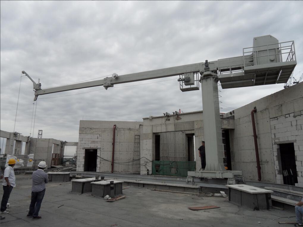 該項目采用3臺屋面軌道式吊臂伸縮設備,其中2臺擦窗機立柱高度在13-17米,采用二級升降系統(tǒng),盡可能地降低了設備的停機高度。