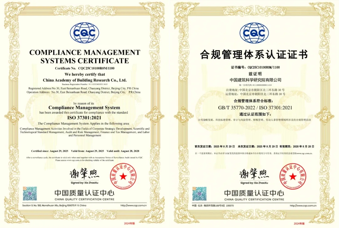 近日,中國建研院成功通過中國質(zhì)量認(rèn)證中心(CQC)合規(guī)管理體系審核,獲得國際標(biāo)準(zhǔn)ISO37301:2021和國家標(biāo)準(zhǔn)GB/T35770-2022認(rèn)證證書,標(biāo)志著公司在合規(guī)治理現(xiàn)代化進(jìn)程中邁出堅(jiān)實(shí)一步。